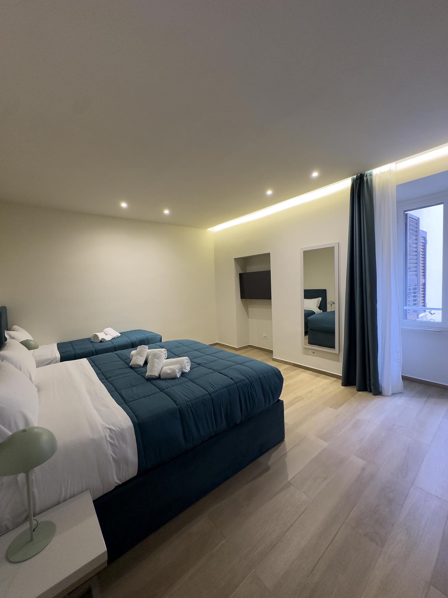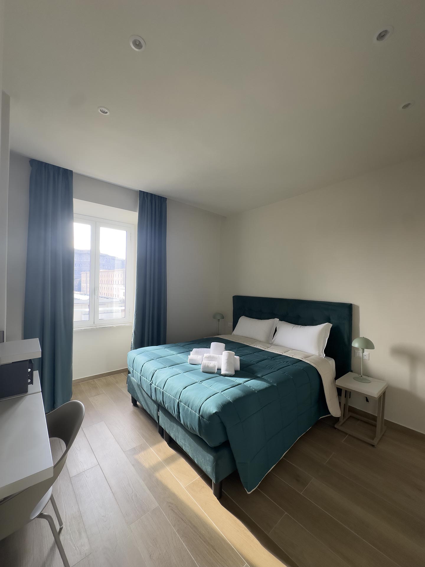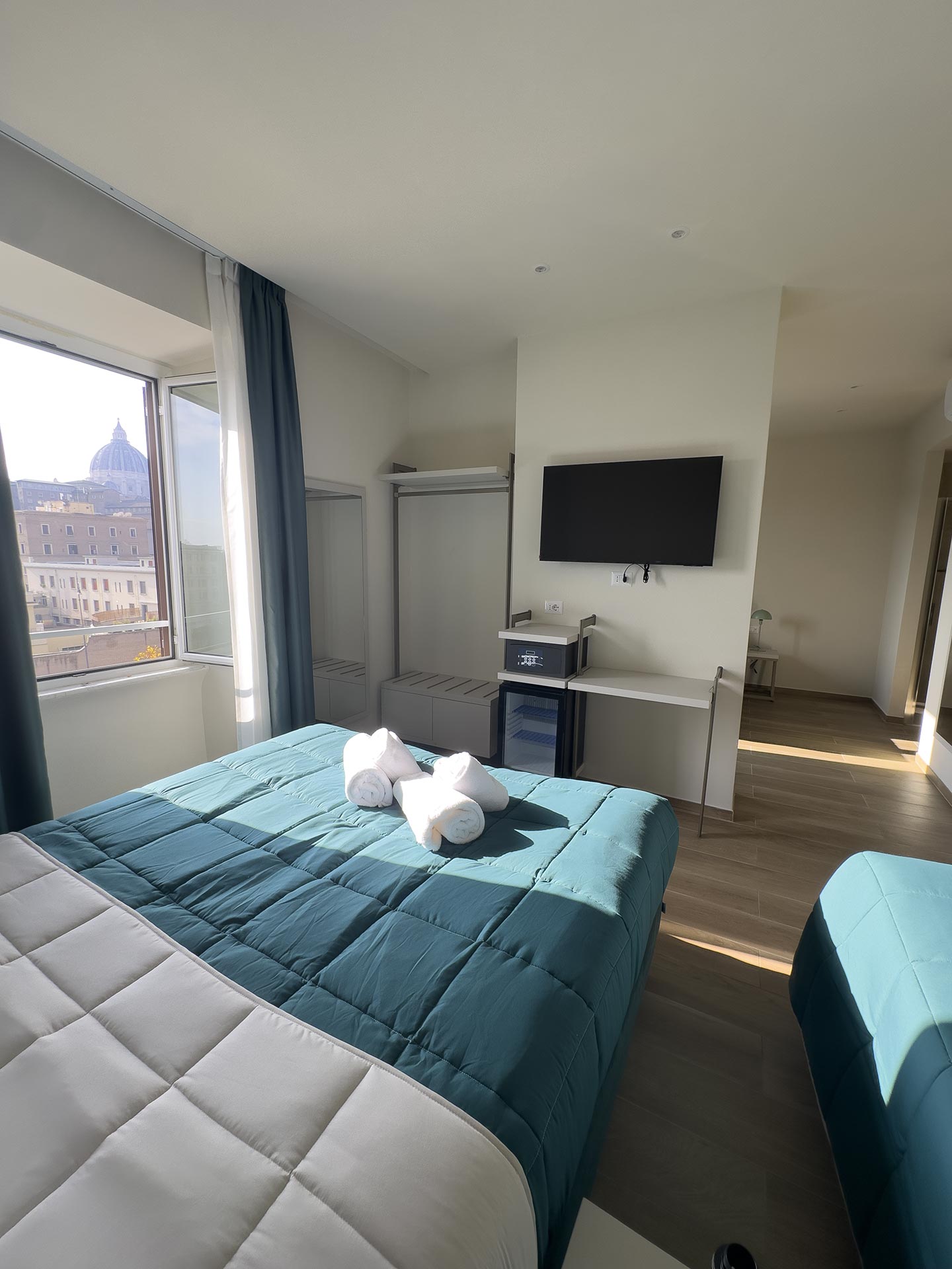 Le camere poste al quinto piano si compongono di la family Augusto da 23mq che può ospitare fino a 3 persone, con un letto matrimoniale ed un singolo, e la vista sulla chiostrina interna; la doppia deluxe Giulio Cesare da 19mq con letto matrimoniale o singoli che si affaccia su Piazza del Risorgimento e gode della vista della cupola di San Pietro, così come la camera top delle nostre strutture, la strepitosa Luxury Family Cicerone da 37mq, composta da 2 camere indipendenti entrambe con bagno privato, che può ospitare fino a 5 persone.