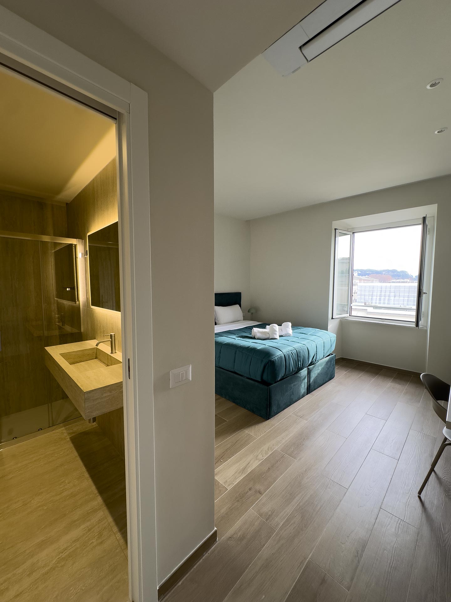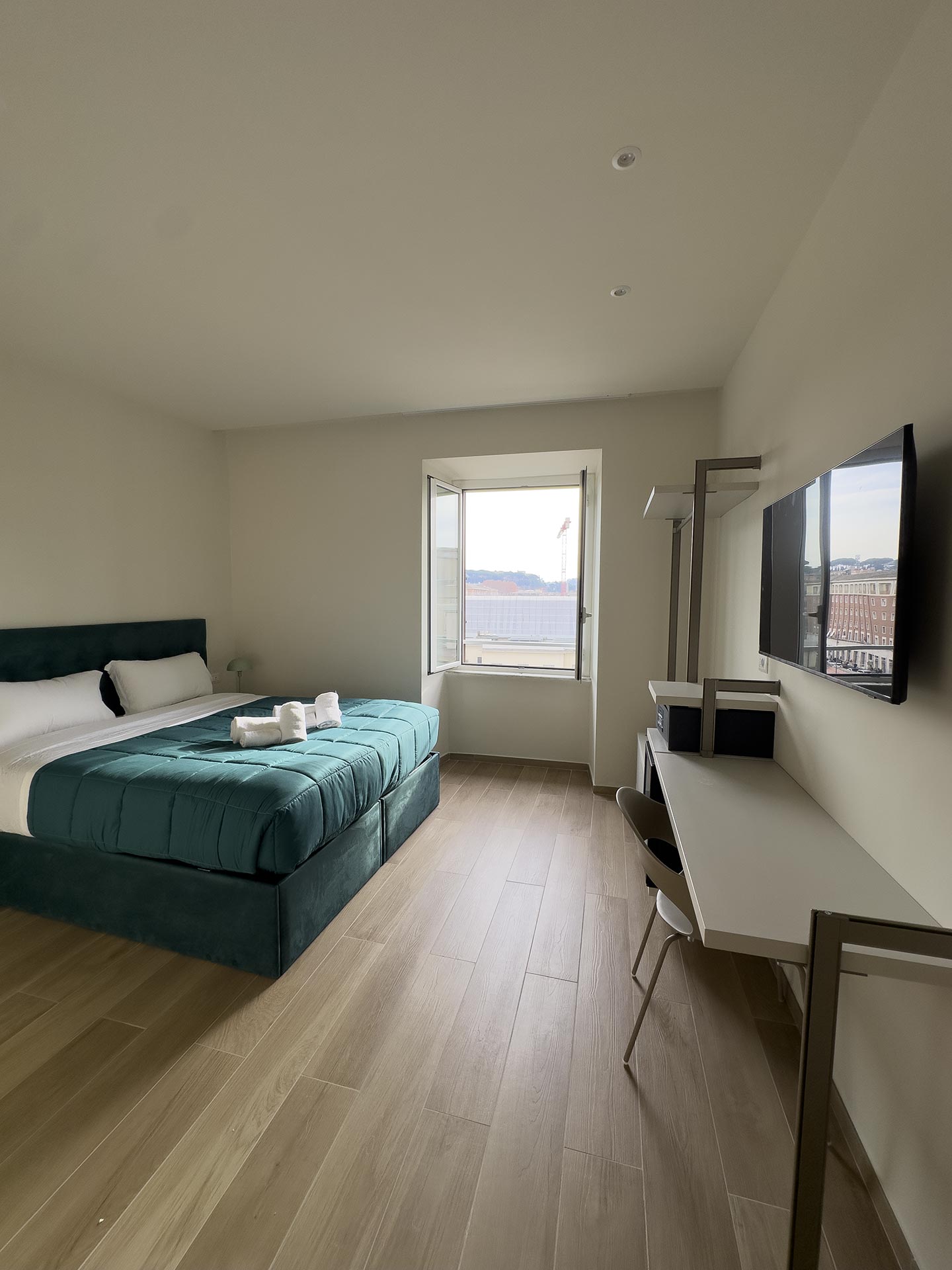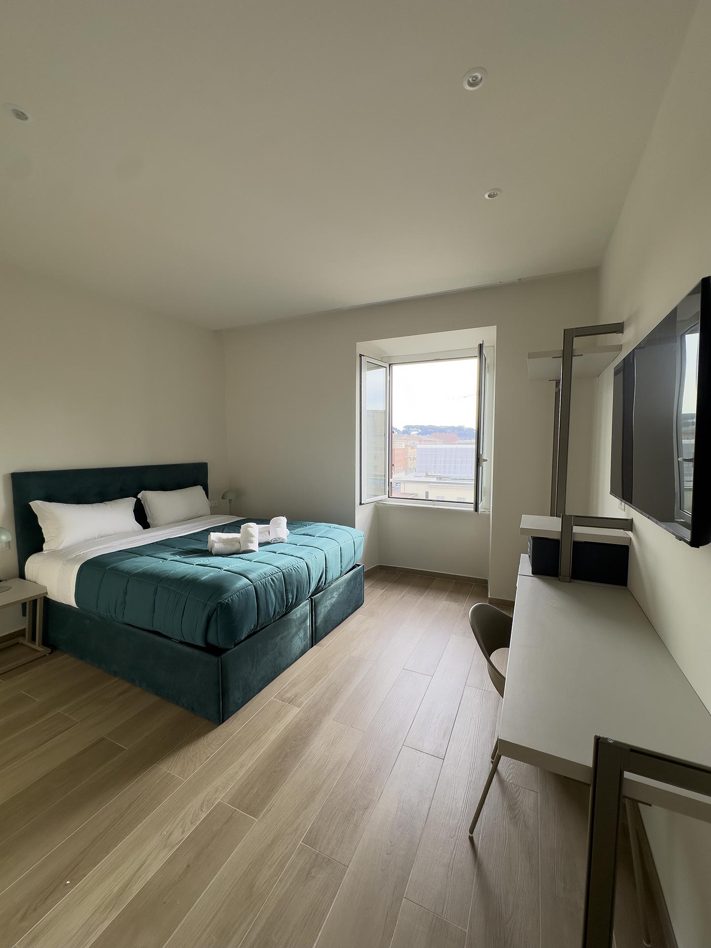 Le camere poste al quinto piano si compongono di la family Augusto da 23mq che può ospitare fino a 3 persone, con un letto matrimoniale ed un singolo, e la vista sulla chiostrina interna; la doppia deluxe Giulio Cesare da 19mq con letto matrimoniale o singoli che si affaccia su Piazza del Risorgimento e gode della vista della cupola di San Pietro, così come la camera top delle nostre strutture, la strepitosa Luxury Family Cicerone da 37mq, composta da 2 camere indipendenti entrambe con bagno privato, che può ospitare fino a 5 persone.